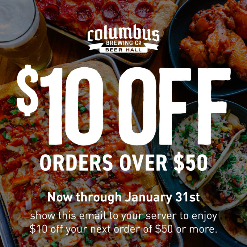 🍻 Enjoy more for less! Get $10 off your Beer Hall order when you spend $50. Offer ends January 31. Show this to your server and save!